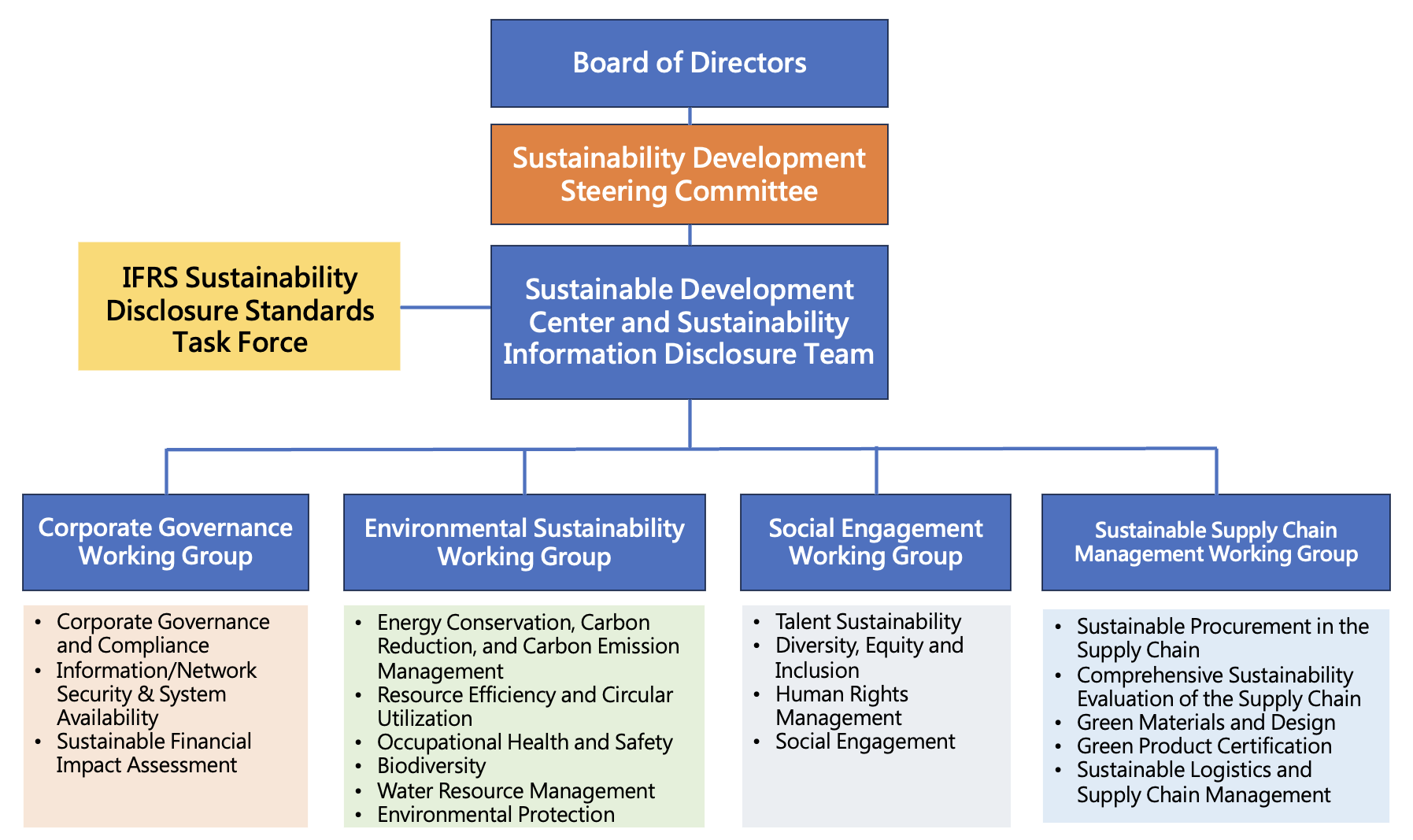 - A dedicated unit, the Sustainability Development Center, operates under the Office of the General Manager and is responsible for advancing corporate sustainability initiatives. The center also functions as the Sustainability Information Disclosure Task Force, managing and disclosing corporate sustainability information.