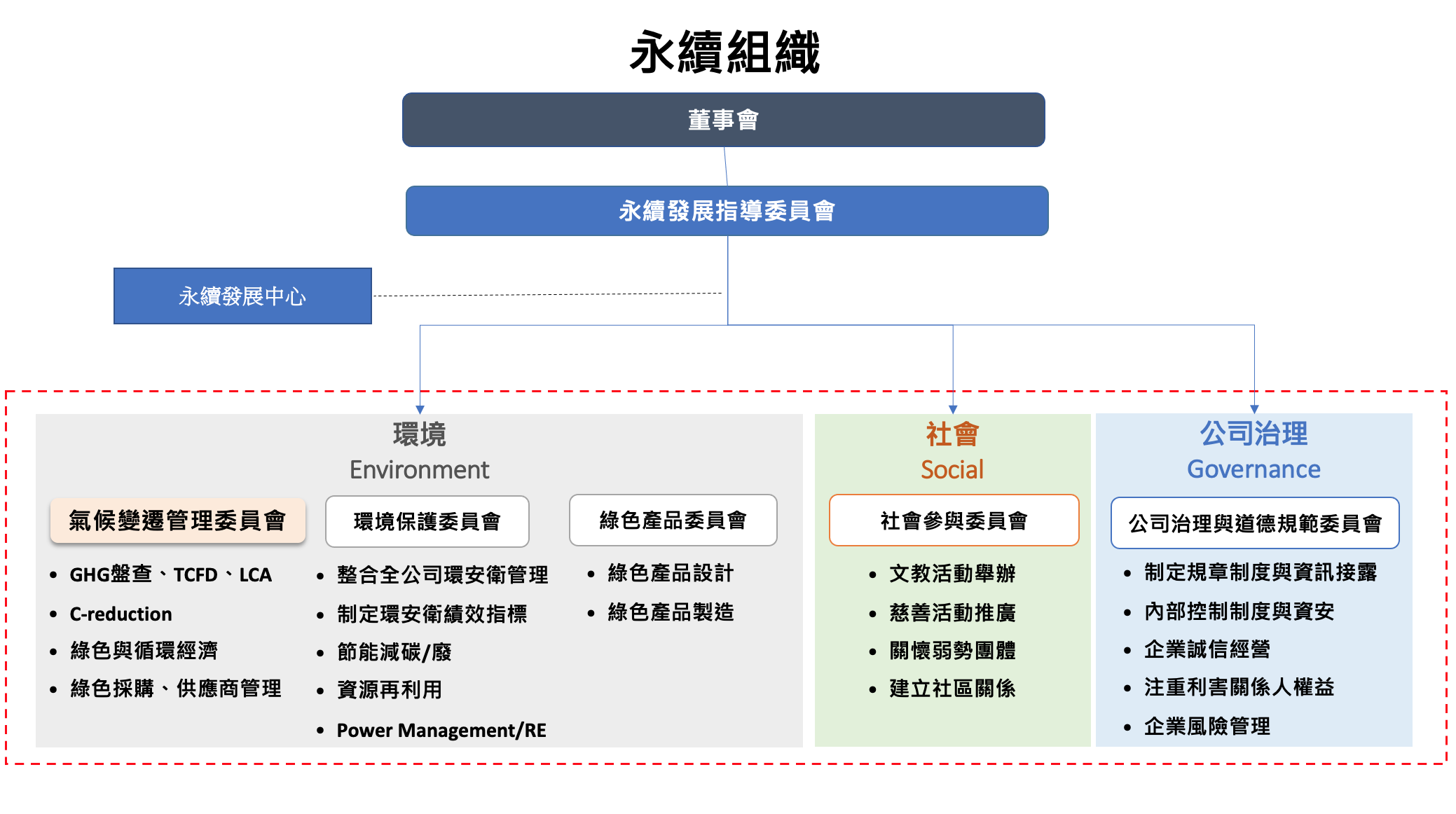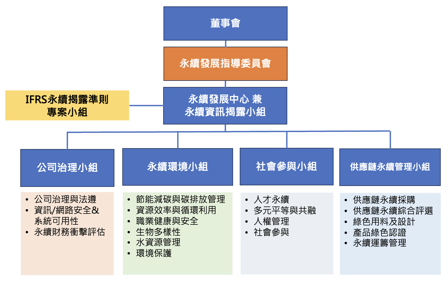 - 「永續發展指導委員會」轄下設置專責單位「永續發展中心」於總經理室組織,負責企業永續發展事務之推動,同時兼任永續資訊揭露小組,管理與揭露企業永續資訊。另設置四個工作小組,分別為「公司治理小組」、「永續環境小組」、「社會參與小組」及「供應鏈永續管理小組」。各小組分別執行企業永續發展之相關工作以完善企業永續發展於各面向之事務。