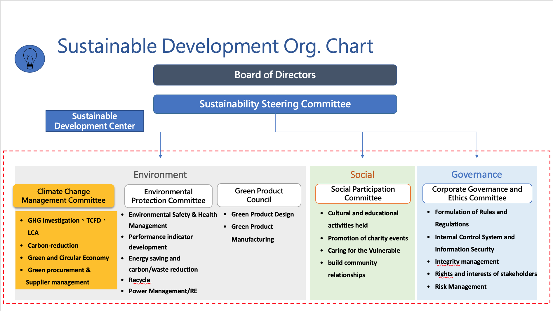 - A dedicated unit, the Sustainability Development Center, operates under the Office of the General Manager and is responsible for advancing corporate sustainability initiatives. The center also functions as the Sustainability Information Disclosure Task Force, managing and disclosing corporate sustainability information.