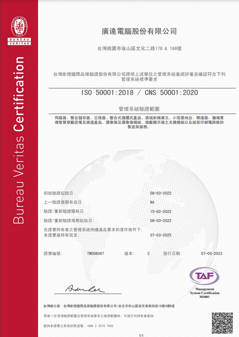 颁发组织: BV 初始验证起始日: 2022.03.08 验证/重新验证稽核日: 2025.01.15 有效期限: 2028.03.07 证书编号: TW007868 ISO 50001:2018证书下载