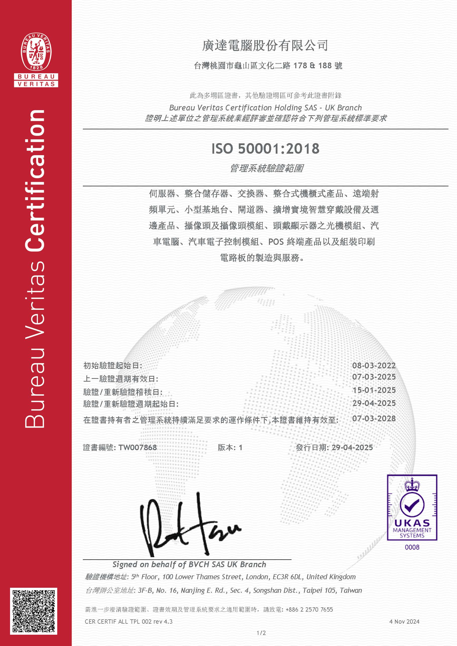 颁发组织: BV 初始验证起始日: 2022.03.08 验证/重新验证稽核日: 2025.01.15 有效期限: 2028.03.07 证书编号: TW007868 ISO 50001:2018证书下载