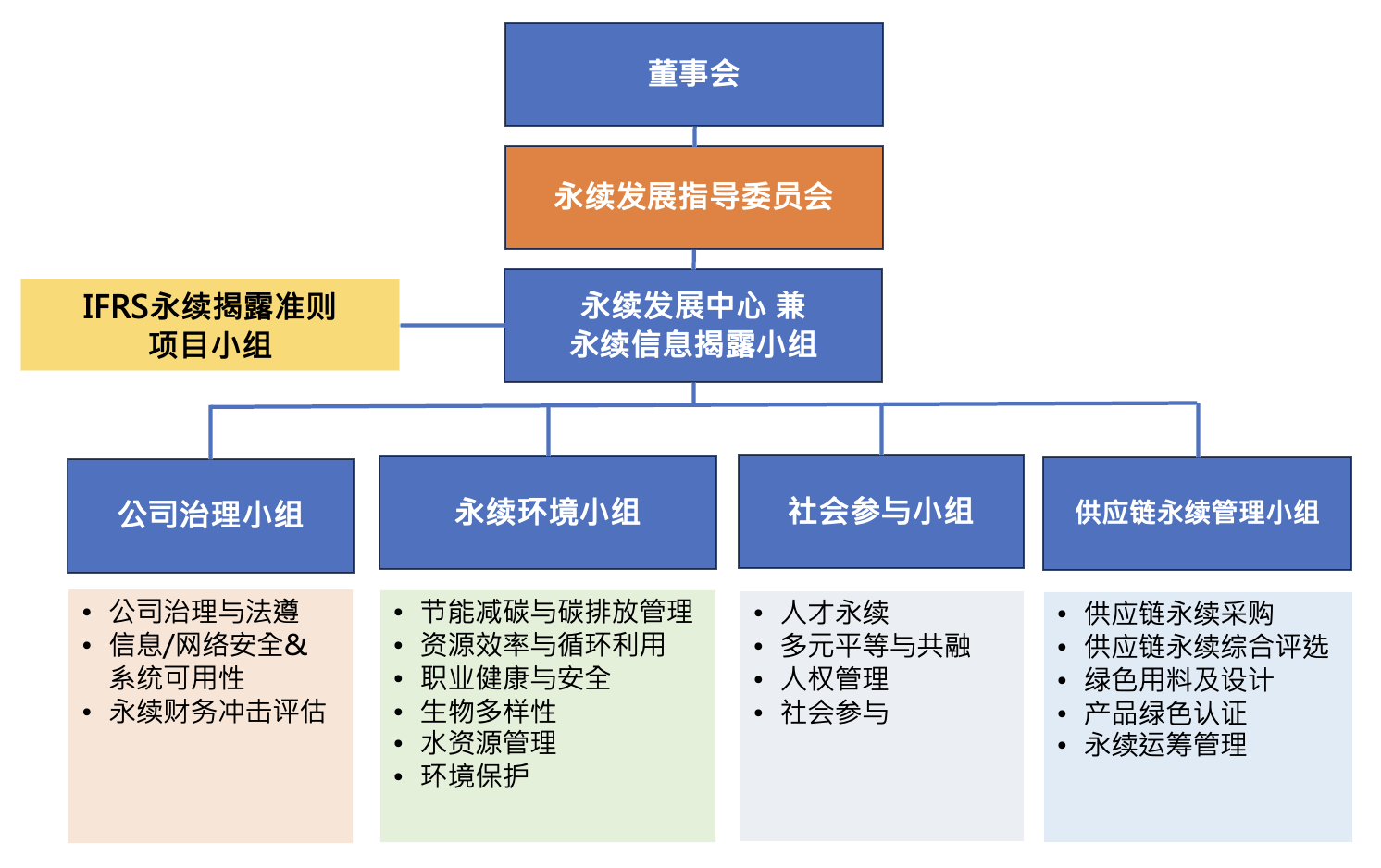 - 「永续发展指导委员会」辖下设置专责单位「永续发展中心」于总经理室组织,负责企业永续发展事务之推动,同时兼任永续信息揭露小组,管理与揭露企业永续信息。另设置四个工作小组,分别为「公司治理小组」、「永续环境小组」、「社会参与小组」及「供应链永续管理小组」。各小组分别执行企业永续发展之相关工作以完善企业永续发展于各面向之事务。